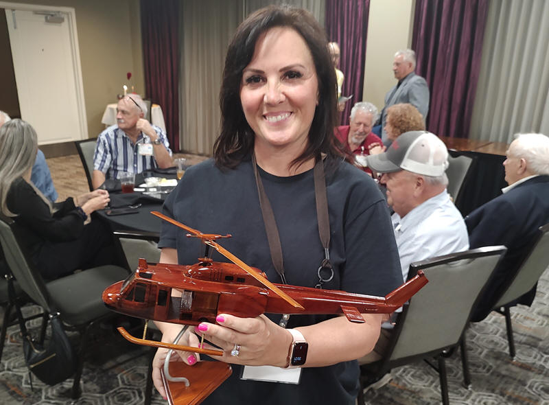 Jamie Spisak holds her winning bid helicopter